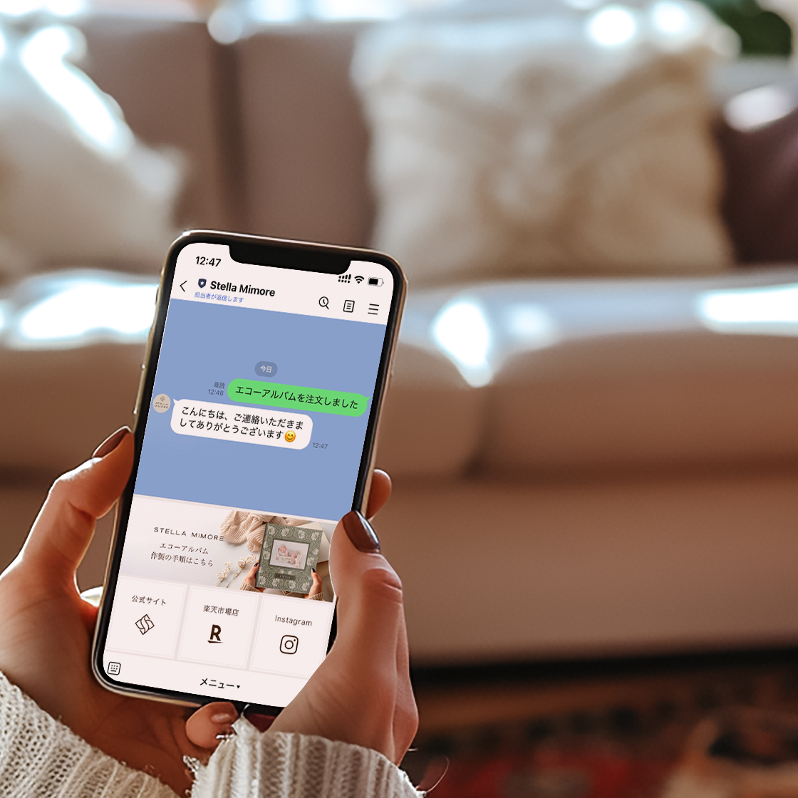 ①公式LINEをご登録後、トークルームに「ご注文番号」「ご注文者名」「エコー写真アルバム」と投稿。